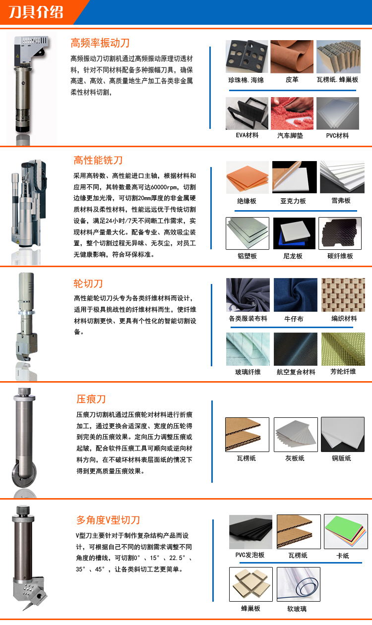 ◆機器多個功能頭可選擇:振動刀切割頭、壓折線輪和繪圖筆。可切割30mm以下的蜂窩板、瓦楞紙、塑料瓦楞板、灰板紙、白卡紙、膠片、復合材料、皮料、布料、膠板、珍珠棉和泡沫KT板等多種材料。